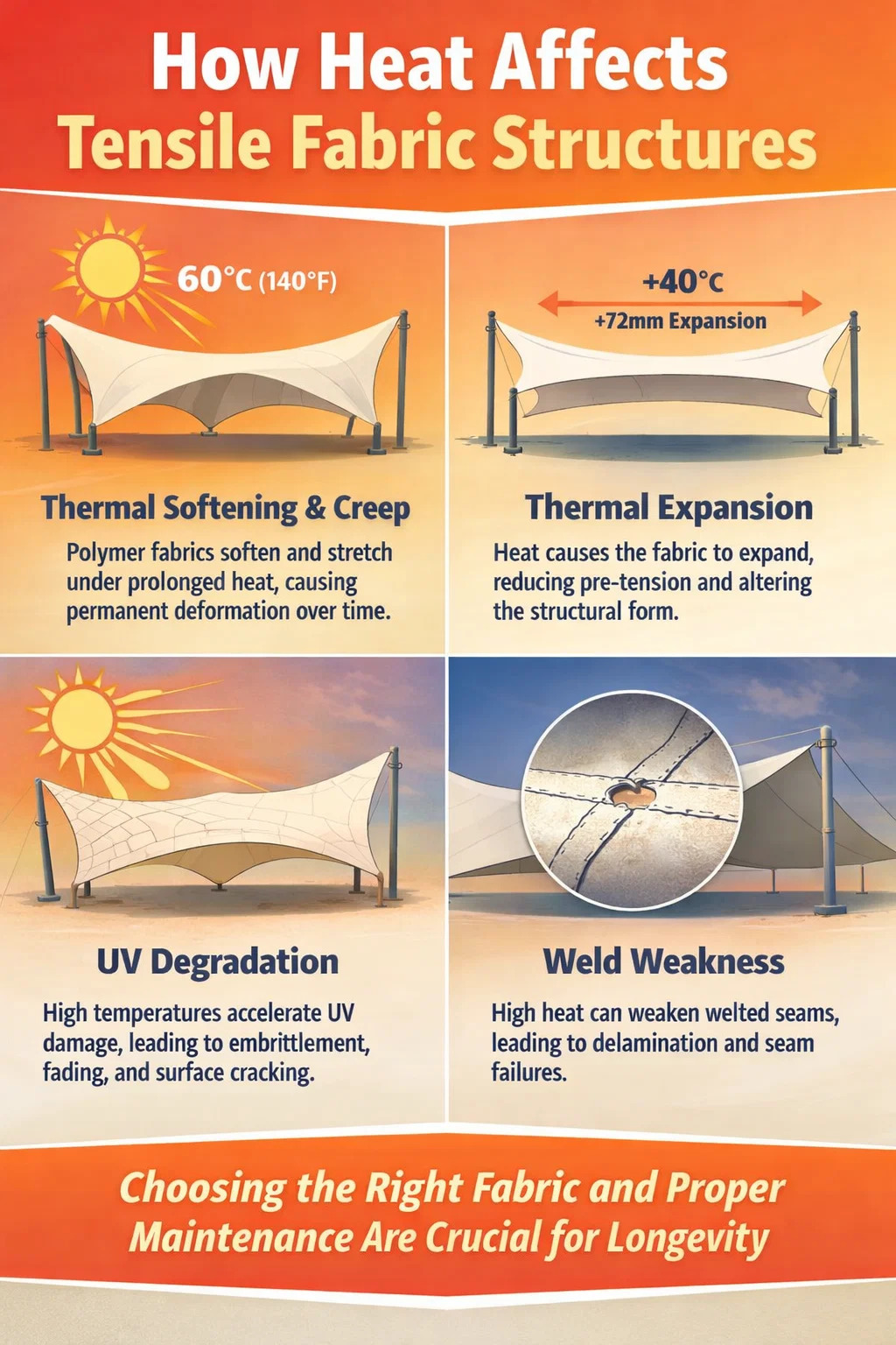熱は、3 つの異なる方法で抗張性生地に影響を与えます。つまり、材料を軟化させ、UV 劣化を促進し、構造に組み込まれたプレテンションを変化させる寸法膨張を引き起こします。これらの各メカニズムを理解することは、適切なファブリックを選択し、現実的なメンテナンスの期待値を設定するのに役立ちます。