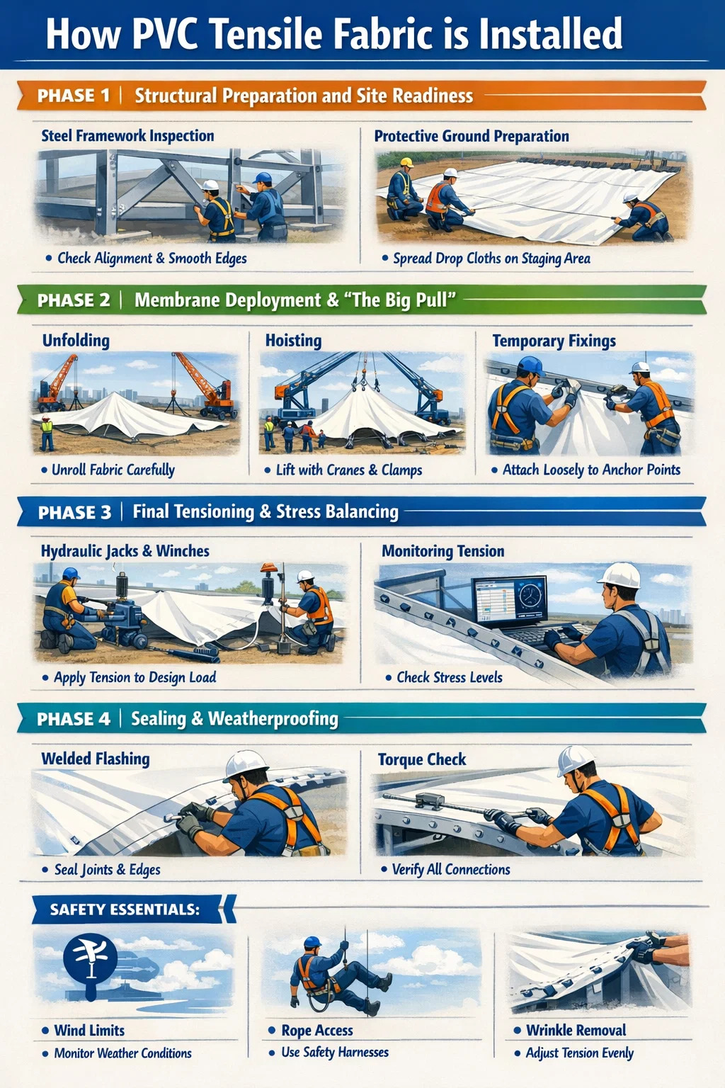 インストール中 PVC引張生地 は、柔軟な膜を剛性の高い構造屋根に変える、精密に設計されたプロセスです。従来の屋根とは異なり、設置は次のことに依存します。 設計された張力 質量というよりも。このプロセスは、主要な鋼鉄または木材の支持構造の建設から始まり、次に生地を慎重に広げ、周囲の固定具に取り付け、風や雪に対する耐荷重を確保するために計算された設計応力まで材料を引っ張る体系的な「張力」段階が続きます。