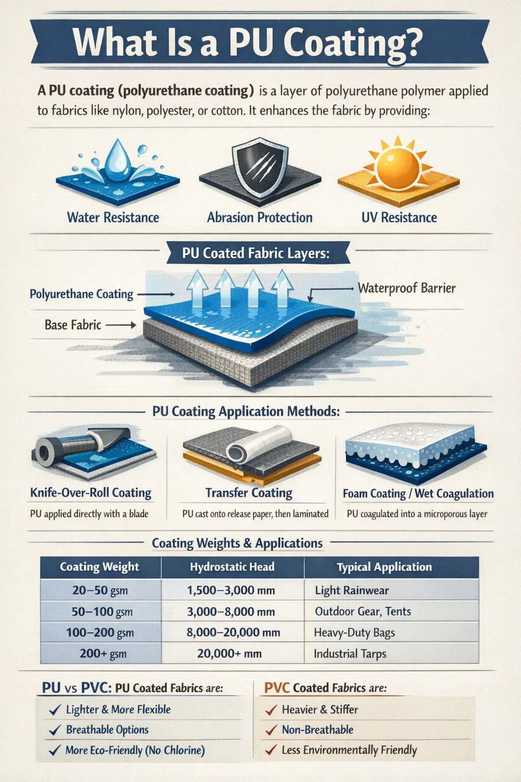 PU コーティング (ポリウレタン コーティングの略称) は、性能特性を高めるためにナイロン、ポリエステル、綿などの基布に直接塗布されるポリウレタン ポリマーの層です。コーティングは繊維表面に化学的および機械的に結合し、水の浸透、摩耗、および多くの処方では紫外線劣化に耐える連続した柔軟なフィルムを作成します。