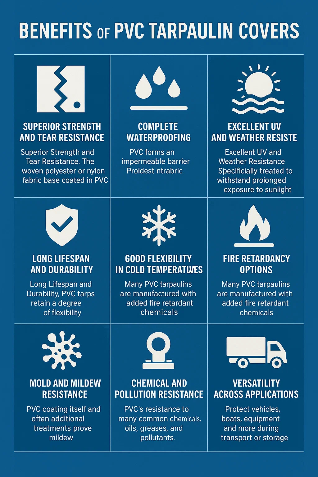 ▸優れた強度と引裂抵抗: ポリエステルまたはナイロンの織布ベースに PVC コーティングを施すことで、非常に丈夫な素材を実現しています。軽量のカバーよりも引き裂き、穴あき、摩耗による損傷に対してはるかに優れています。これにより、要求の厳しい環境や過酷な使用に最適です。